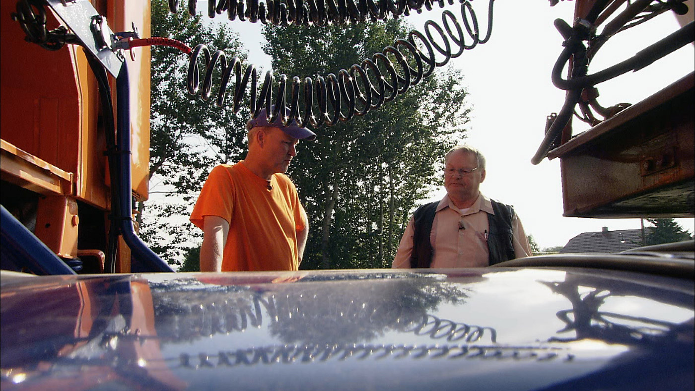 Größenvergleich eines heutigen Speditionsfahrzeuges mit einem Oldtimer aus den 80er Jahren