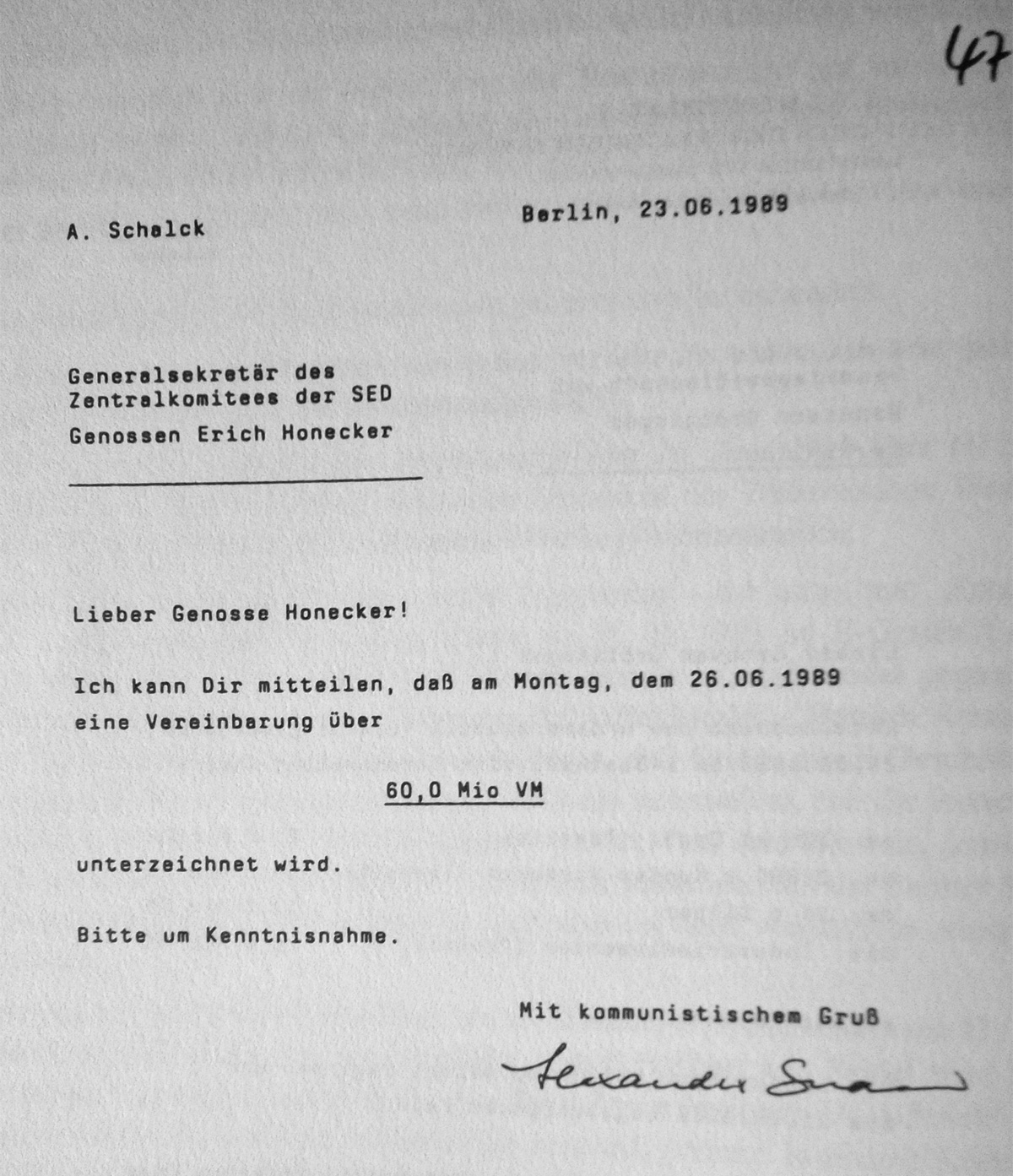 | 1963-1989 | Insgesamt 31.775 Personen werden von der BRD aus DDR-Haft freigekauft. 3,4 Mrd. DM wendet die BRD dafür insgesamt auf. DDR-Vertreter sprechen von bis zu 8 Mrd. DM. Die Zahlen müssen also noch heute hinterfragt werden. |