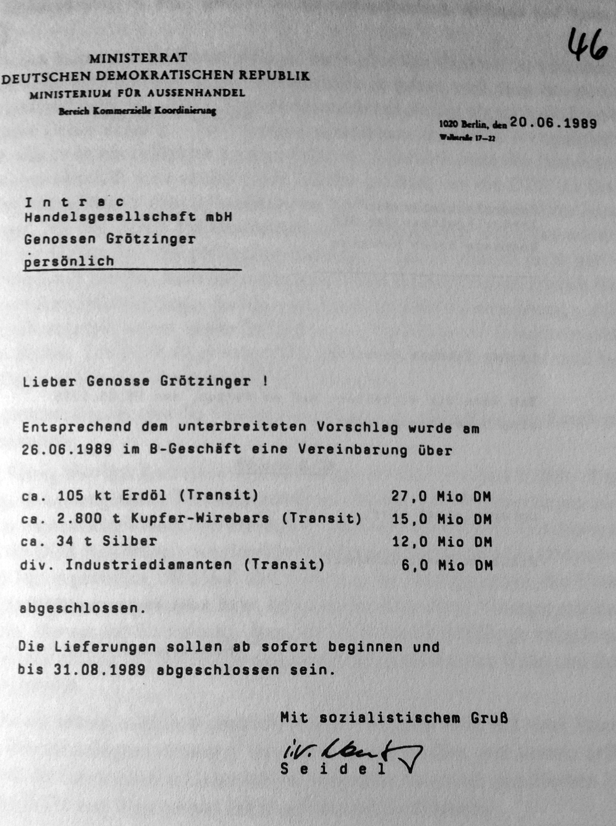 Information des Ministerrates der DDR an Intrac GmbH (DDR-Firma im Westen)