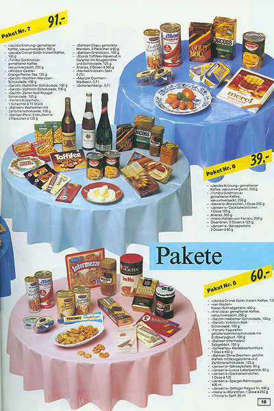 Insbesondere im Bereich der Konsumgüter war die BRD aus den genannten Gründen dem Osten massiv überlegen. Sehr schnell befriedigte der Kontakt zwischen den Menschen das Hilfebedürfnis der Westdeutschen und die Entbehrungen der Ostdeutschen. Die Folge waren Paketaktionen der Kirche, Geldsendungen mit der „harten“ D-Mark und ein blühender Warenschmuggel. Die DDR-Regierung hatte von Anfang an alle Hände voll zu tun, ihr eigenes Überleben zu sichern und ihre politische Existenz zu legitimieren. Da waren die begehrten Westpakete trotz der Versorgungsleistung schlechte Werbung für den Sozialismus. Darum bemühte sie sich Anfang der 50er Jahre um eine kontrollierte Kanalisierung des Warenverkehrs und beschränkte die „Einfuhr“ westlicher Konsumgüter.