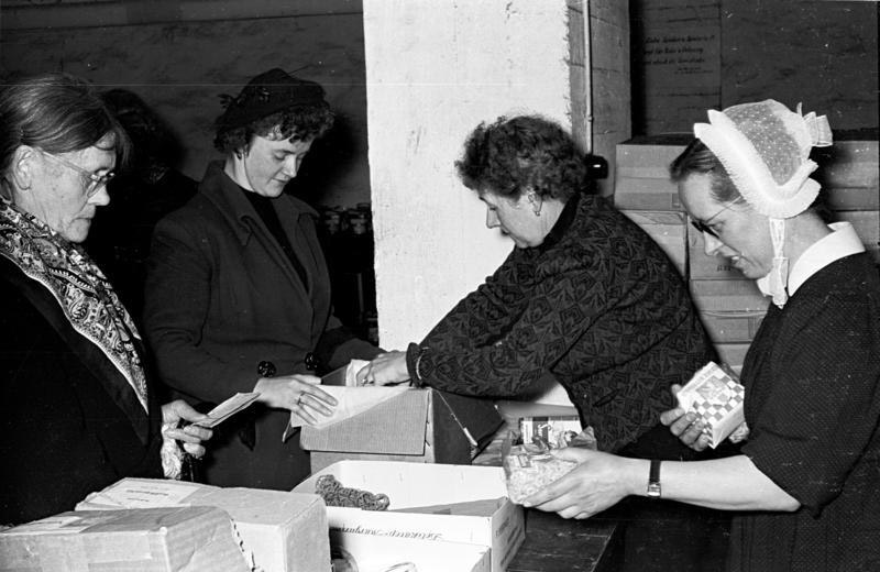 Innere Mission und Hilfswerk der Evangelischen Kirche erhalten und verteilen Care-Pakete. 1954
